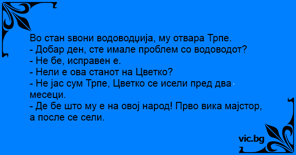 Во стан ѕвони водоводџија, му отвара Трпе.
