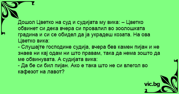 Дошол Цветко на суд и судијата му вика: – Цветко обвинет си дека вчера си провалил во зоолошката градина и си се обидел да ја украдеш козата. На ова Цветко вика: