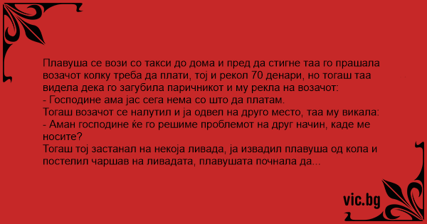Плавуша се вози со такси до дома и пред да стигне таа го прашала возачот колку треба да плати, тој и рекол 70 денари, но тогаш таа видела дека го загубила паричникот и му рекла на возачот: