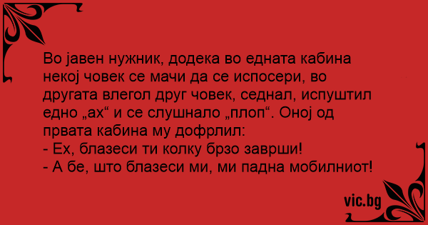 Во јавен нужник, додека во едната кабина некој човек се мачи да се испосери, во другата влегол друг човек, седнал, испуштил едно „ах“ и се слушнало „плоп“. Оној од првата кабина му дофрлил: