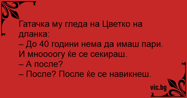 Јасновидец му ја кажува судбината на млад човек: - До 50-тата година ќе страдаш од недостаток на пари. - А потоа? - Потоа ќе се навикнеш.