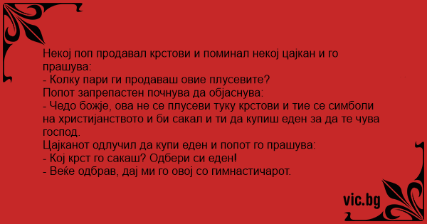 Некој поп продавал крстови и поминал некој цајкан и го прашува:
