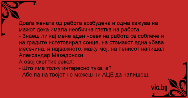 - Знаеш ли кај мене еден човек на работа се соблече и на градите истетовирал сонце, на стомакот една убава месечина, и најважното, мажу мој, на пенисот напишал Александар Македонски.