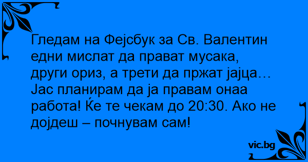 Гледам на Фејсбук за Св. Валентин едни мислат да прават мусака, други ориз, а трети да пржат јајца…
