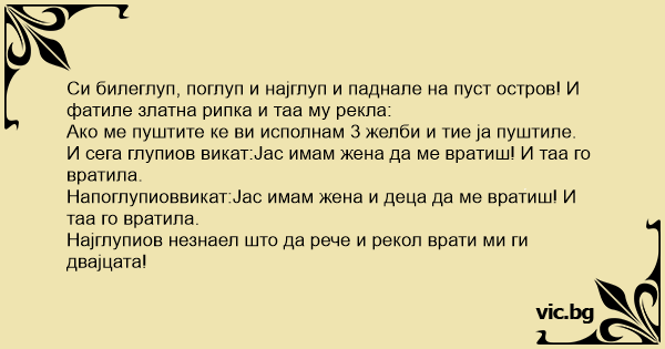 Си билеглуп, поглуп и најглуп и паднале на пуст остров! И фатиле златна рипка и таа му рекла: