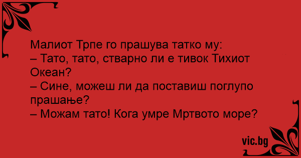 Πόντια δασκάλα Татко,тихия океан наистина ли е тих? - Татко, Тихият океан непрекъснато ли е тих? Fragt der Sohn den Vater: Peter: „Mami, ist der stille Ozean wirklich ganz still?“ Mutter: „Peter, kannst Du nicht mal was vernünftiges fragen?“ Peter: „Hm, wann ist das tote Meer gestorben?“ - Pappa, er Stillehavet alltid stille? - Hva er det slags spørsmål, kom heller med et fornuftig et? - Ok, når døde Dødehavet? Petriukas klausia: - Mama, ar Ramusis vandenynas visada ramus? - Ar negali paklausti ko nors protingesnio? - nepatenkinta sako mama. - Galiu. Tada pasakyk nuo ko numirė Negyvoji jūra?