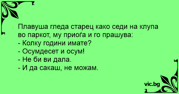 Плавуша гледа старец како седи на клупа во паркот, му приоѓа и го прашува: