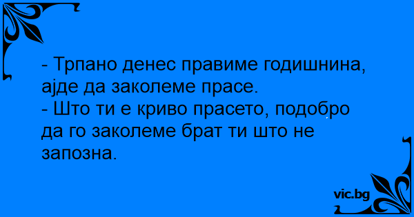 - Што ти е криво прасето, подобро да го заколеме брат ти што не запозна.