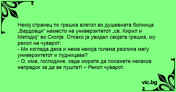 Некој странец по грешка влегол во душевната болница „Бардовци“ наместо на универзитетот „св. Кирил и Методиј“ во Скопје. Откако ја увидел својата грешка, му рекол на чуварот: