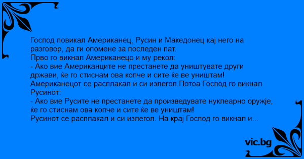 Американецот се расплакал и си излегол.Потоа Господ го викнал Русинот:
