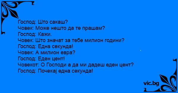 Ρωτάει ο άνθρωπος τον Θεό: - Θεούλη μου τι είναι για σένα ένα δισεκατομμύριο; Θεός: - Μια δραχμή Ανθρωπος: Θεούλη μου τι είναι για σένα 1 εκατομμύριο χρόνια; Θεός: Μια στιγμή! Ανθρωπος: Θεούλη μου...
