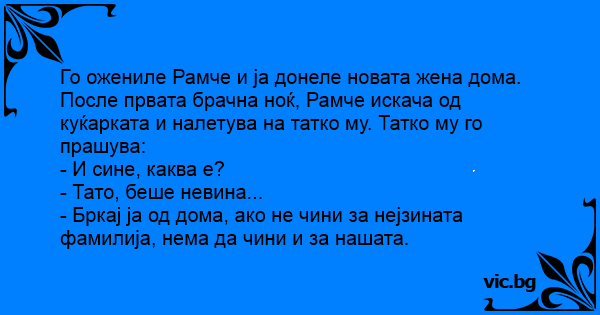 Го ожениле Рамче и ја донеле новата жена дома. После првата брачна ноќ, Рамче искача од куќарката и налетува на татко му. Татко му го прашува: