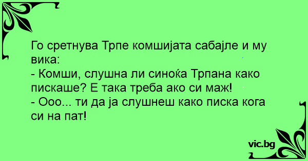 - Комши, слушна ли синоќа Трпана како пискаше? Е така треба ако си маж!