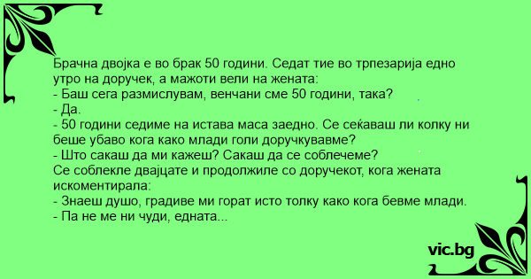 Брачна двојка е во брак 50 години. Седат тие во трпезарија едно утро на доручек, а мажоти вели на жената: