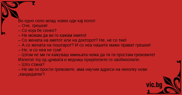 Оди Трпе кај селскиот поп да се исповеда. - Оче згрешив, најсрамниот грев го направив! - Кажи чедо, Бог е милостив ќе ти прости... - Не можам оче срам ми е! - Да не е со Митра на воденичарот? - Не...