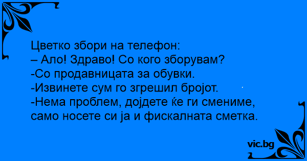 - Ало, с кого разговарям? - С продавачката от магазина за обувки. - Сбъркал съм номера... - Няма проблем, елате да ги сменим!