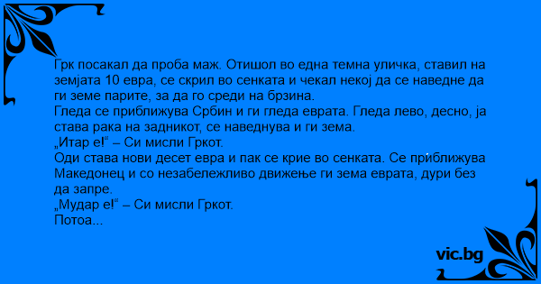„Горд е!“ – Си мисли Гркот. Оди да си ги земе еврата, се наведнува и извикува… „Ииииитаррррр е!!!“