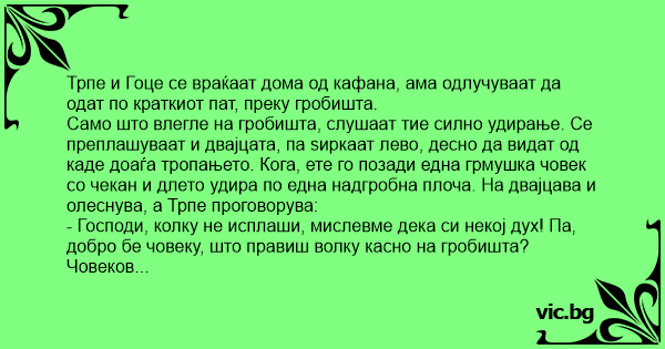 - Господи, колку не исплаши, мислевме дека си некој дух! Па, добро бе човеку, што правиш волку касно на гробишта?