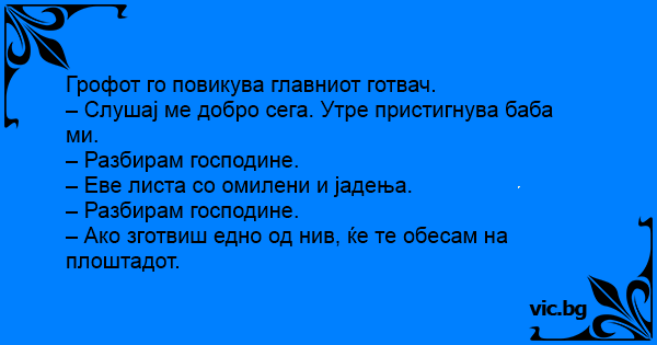 Zavolal si lord svého kuchaře a povídá: „Zítra přijede moje tchýně, tady je seznam jejích oblíbených jídel!” „Ano, pane.” „Ale jakmile jí jen jedno z nich připravíte, okamžitě vás vyhodím!”