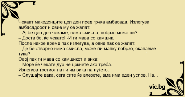 – Слушајте вака, сега сите ќе влезете, ама има еден услов. На почетокот на редот кај што ќе ви ги даваат визите има еден црнец и ќе мора сите да ве опне од позади.
