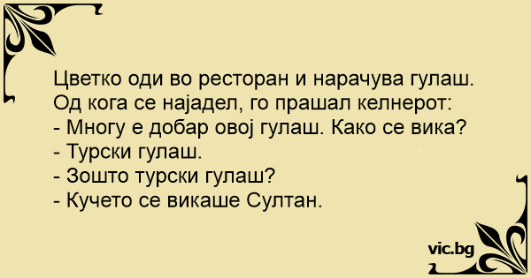 Цветко оди во ресторан и нарачува гулаш. Од кога се најадел, го прашал келнерот: