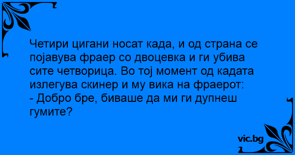 Четири цигани носат када, и од страна се појавува фраер со двоцевка и ги убива сите четворица. Во тој момент од кадата излегува скинер и му вика на фраерот: