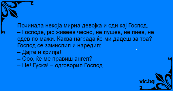 – Господе, јас живеев чесно, не пушев, не пиев, не одев по мажи. Каква награда ќе ми дадеш за тоа?