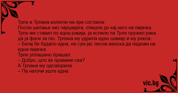После шетање низ чаршијата, отишле до кај него на пијачка. Трпе им ставил по една ракија, ја испиле па Трпе пружил рака да ја фати за газ. Трпана му удрила еден шамар и му рекла: