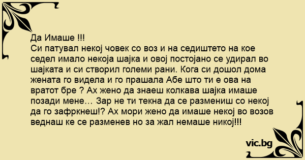 Си патувал некој човек со воз и на седиштето на кое седел имало некоја шајка и овој постојано се удирал во шајката и си створил големи рани. Кога си дошол дома жената го видела и го прашала Абе што ти е ова на вратот бре ? Ах жено да знаеш колкава шајка имаше позади мене… Зар не ти текна да се размениш со некој да го зафркнеш!? Ах мори жено да имаше некој во возов веднаш ке се разменев но за жал немаше никој!!!