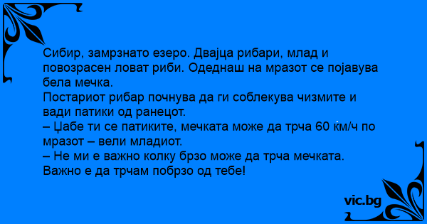 Чукча и геолог събират камъни на брега на океана. Изведнъж виждат към тях да се насочва огромна, свирепа бяла мечка. Чукчата започва бързо да си обува ските. Геологът: - Това е безполезно. Все едно не можеш да бягаш по-бързо от мечката. - А на мен не ми и трябва да бягам по-бързо от нея. На мен...
