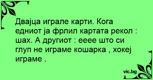 Двајца играле карти. Кога едниот ја фрлил картата рекол : шах. А другиот : ееее што си глуп не играме кошарка , хокеј играме .