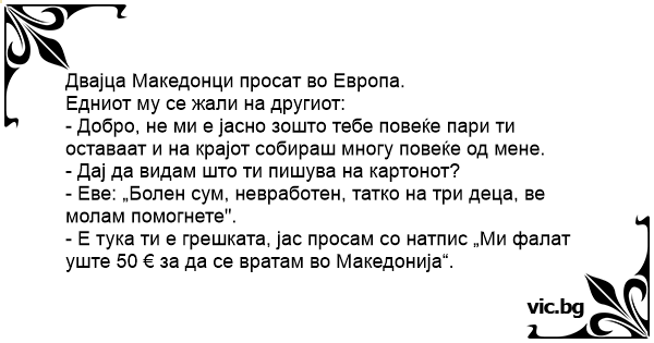 - Е тука ти е грешката, јас просам со натпис „Ми фалат уште 50 € за да се вратам во Македонија“.