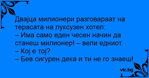 – Има само еден чесен начин да станеш милионер! – вели едниот.