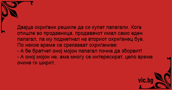 Двајца охриѓани решиле да си купат папагали. Кога отишле во продавница, продавачот имал само еден папагал, па му подметнал на вториот охриѓанец був.