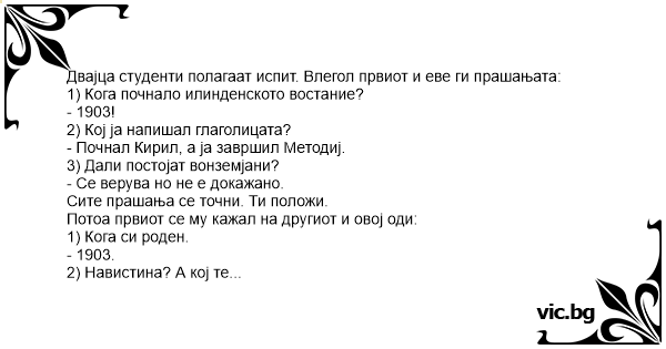 Двајца студенти полагаат испит. Влегол првиот и еве ги прашањата: