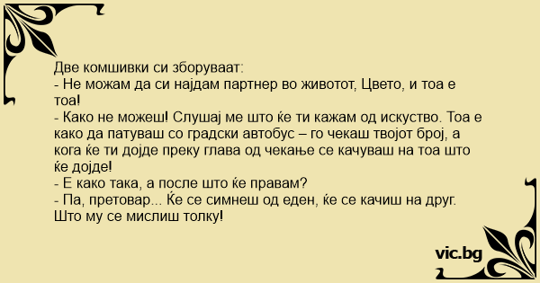 - Како не можеш! Слушај ме што ќе ти кажам од искуство. Тоа е како да патуваш со градски автобус – го чекаш твојот број, а кога ќе ти дојде преку глава од чекање се качуваш на тоа што ќе дојде!