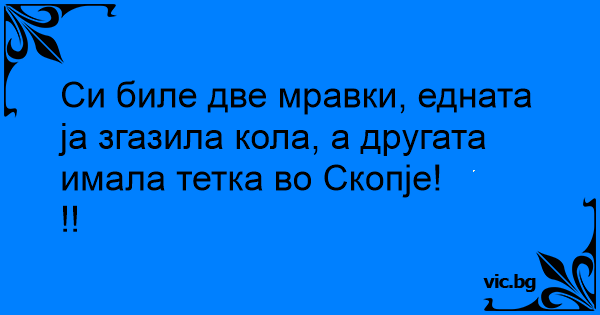 Си биле две мравки, едната ја згазила кола, а другата имала тетка во Скопје!