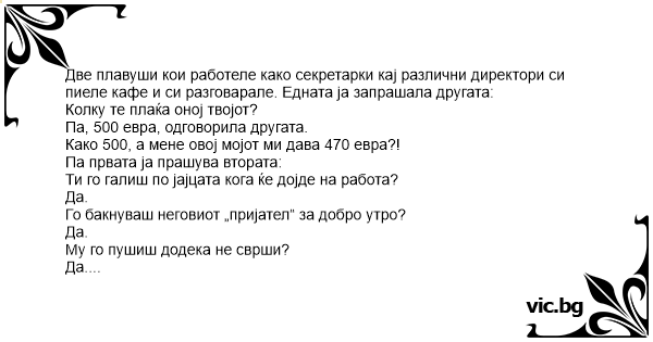 Две плавуши кои работеле како секретарки кај различни директори си пиеле кафе и си разговарале. Едната ја запрашала другата: