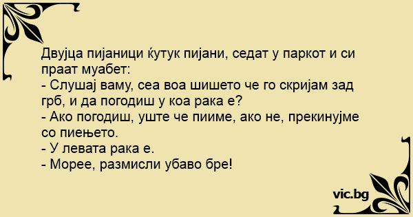 Двујца пијаници ќутук пијани, седат у паркот и си праат муабет: