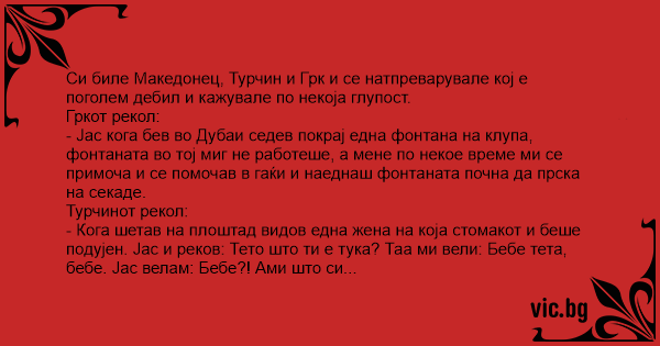 Си биле Македонец, Турчин и Грк и се натпреварувале кој е поголем дeбил и кажувале по некоја глупост.