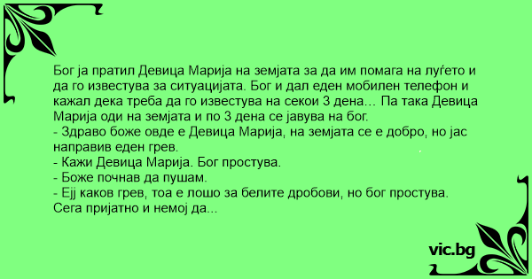 Бог ја пратил Девица Марија на земјата за да им помага на луѓето и да го известува за ситуацијата. Бог и дал еден мобилен телефон и кажал дека треба да го известува на секои 3 дена… Па така Девица Марија оди на земјата и по 3 дена се јавува на бог.