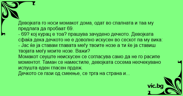 - 69? кој курац е тоа? прашува зачудено дечкото. Девојката сфаќа дека дечкото не е доволно искусен во сескот па му вика: