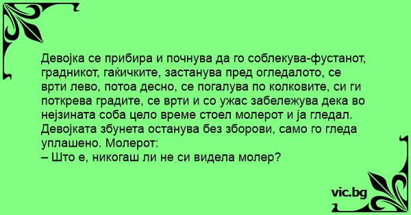 Девојката збунета останува без зборови, само го гледа уплашено. Молерот: