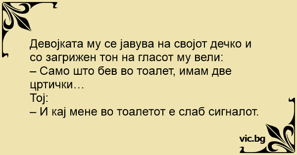 Тя: - Бях в тоалетната, имам две черти... Той: - И при мен в тоалетната е слаб сигналът...