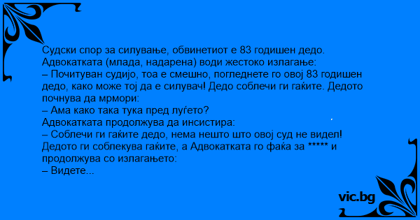 – Почитуван судијо, тоа е смешно, погледнете го овој 83 годишен дедо, како може тој да е силувач! Дедо соблечи ги гаќите. Дедото почнува да мрмори: