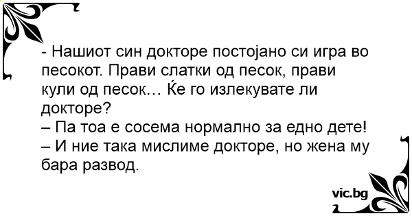 - Нашиот син докторе постојано си игра во песокот. Прави слатки од песок, прави кули од песок… Ќе го излекувате ли докторе?