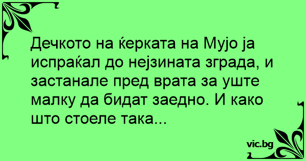 Дечкото на ќерката на Мујо ја испраќал до нејзината зграда, и застанале пред врата за уште малку да бидат заедно. И како што стоеле така...