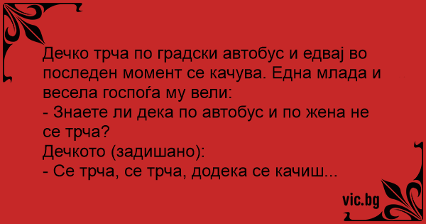 Дечко трча по градски автобус и едвај во последен момент се качува. Една млада и весела госпоѓа му вели: