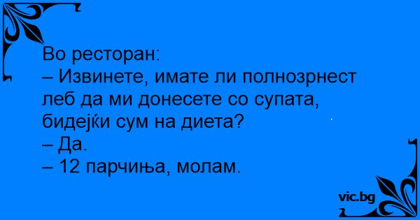 – Извинете, имате ли полнозрнест леб да ми донесете со супата, бидејќи сум на диета?