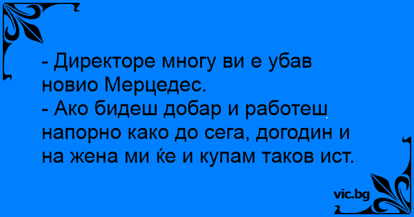 Директоре, многу убав Мерцедес сте купиле! - Ааа фала. Ако работиш и натаму напорно како до сега, догодина и на жена ми ке и' купам ваков.